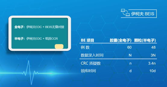 伊柯夫BEIS与EDC系统可实现无缝对接,节省了源数据转抄、CRF人工录入到EDC系统的时间,可将BE研究周期缩短到3-4 个月,不仅为申办方赢得了提前上市的机会,同时为申办方节约数十万元的直接投入。